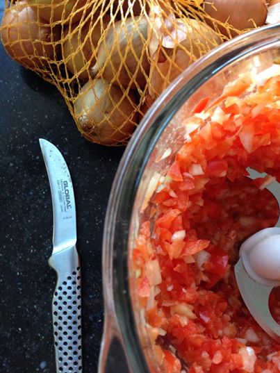 - Finely dice the union, bell pepper, chili pepper